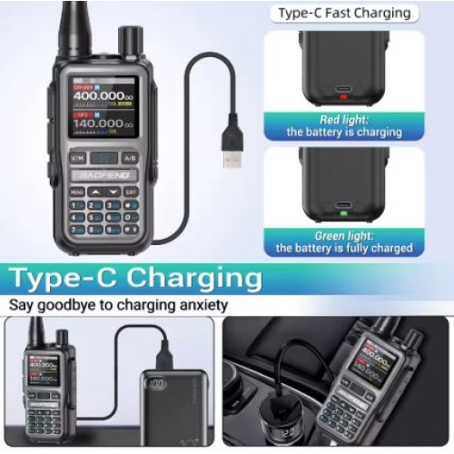 The UV-5R Mini is powered by a USB-C rechargeable lithium-ion battery, making it easy to charge from common power sources such as wall adapters, power banks, or laptops. This makes it especially well suited for travel, field use, and emergency preparedness kits. Additional features include dual PTT buttons for quick channel selection, VOX hands-free operation, frequency reverse, channel cloning between radios, and a built-in LED flashlight for low-light situations.